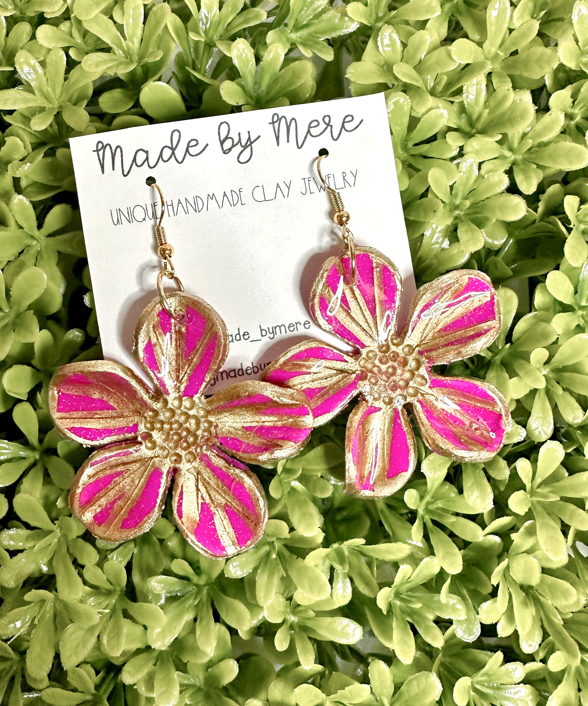 Handmade with polymer clay, resin, bronze gold paint, and 18k gold plated hoops