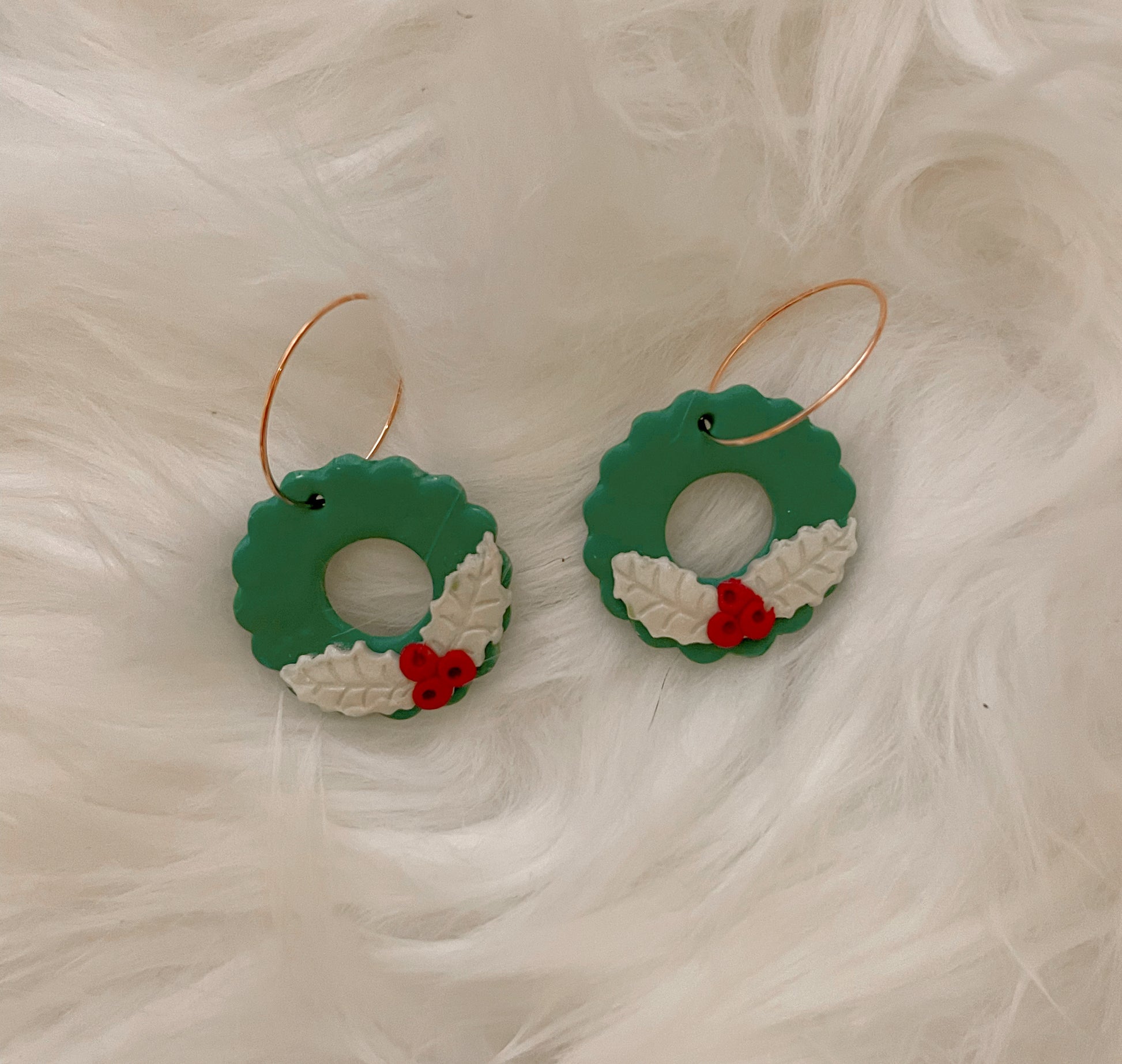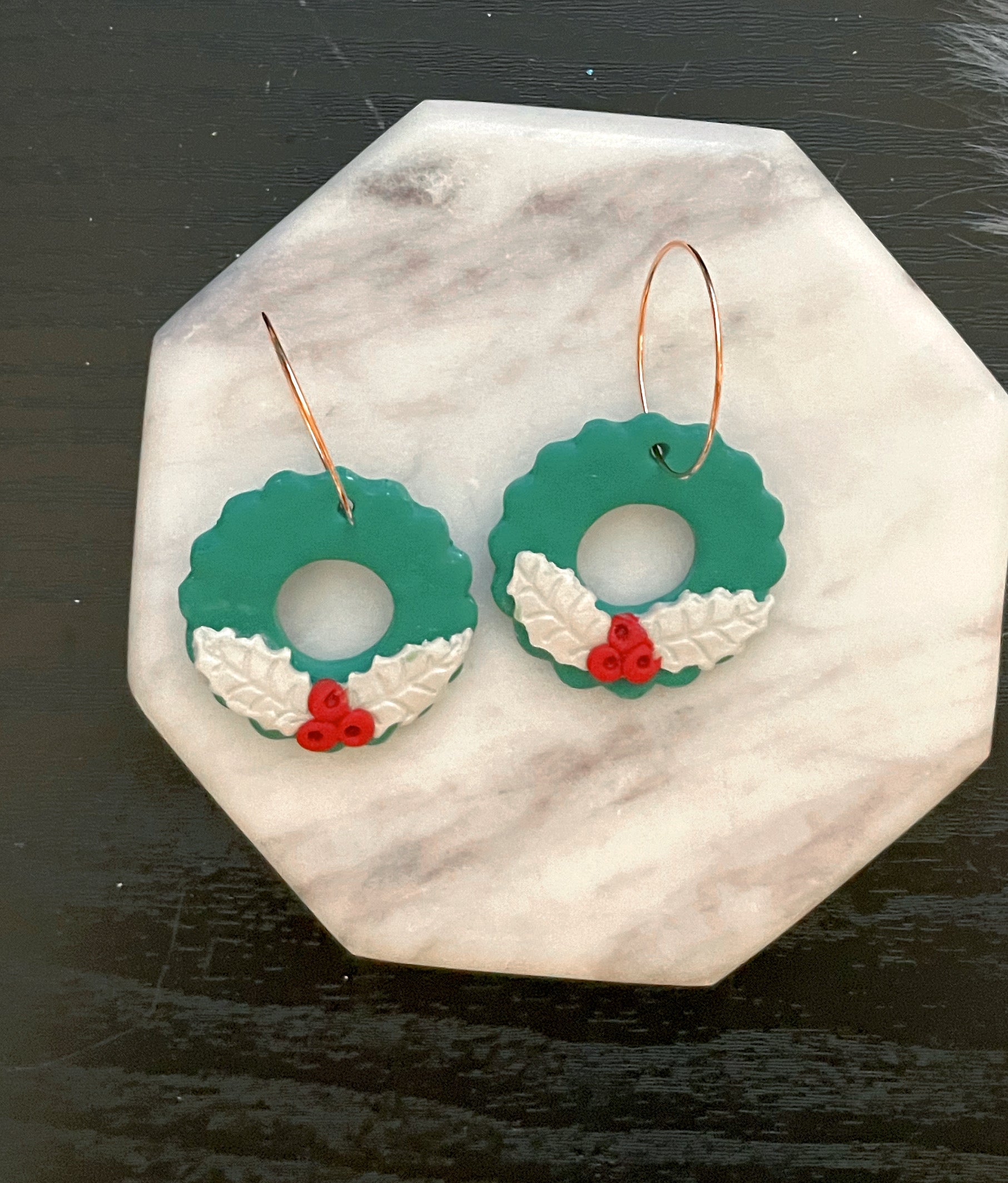 Handmade with polymer clay and gold hoops.